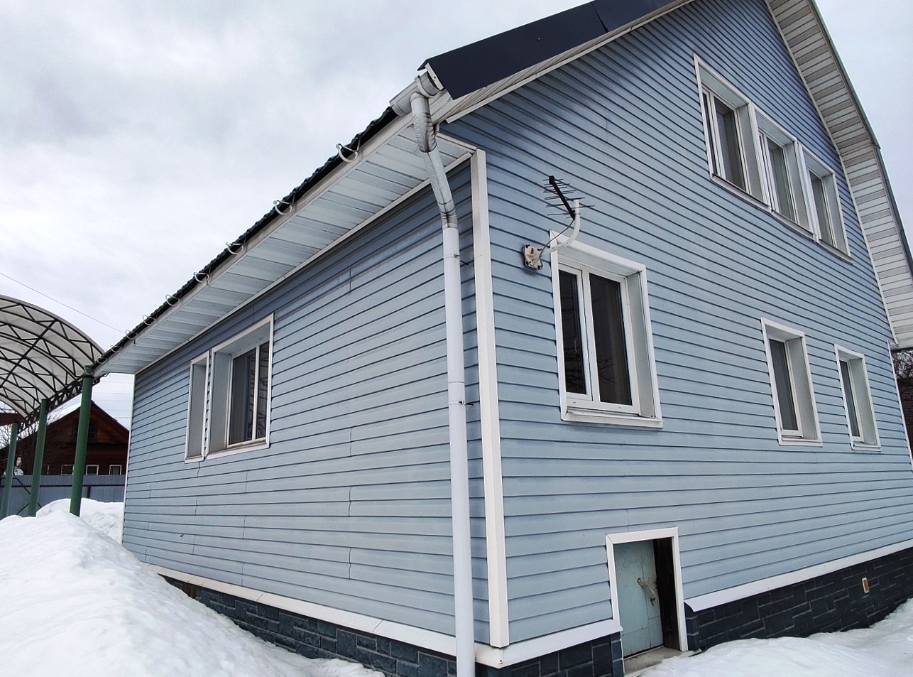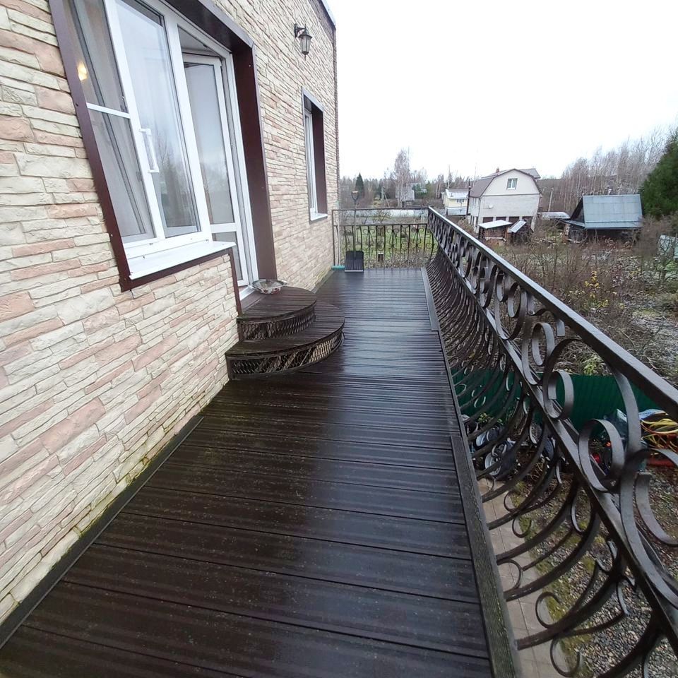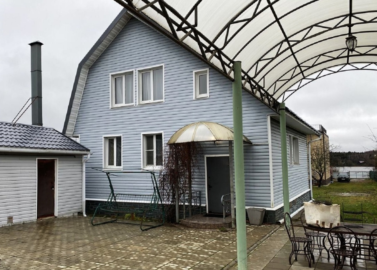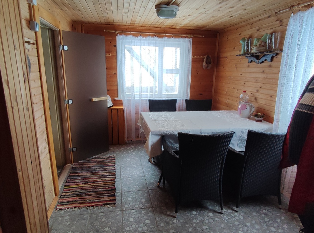 2) Двухэтажный гостевой ДОМ площадью 170 м2. Год постройки 1996. Кровля металлочерепица, ленточный фундамент с цокольным этажом, пол залит бетоном, материал стен рубленое бревно с утеплением, снаружи обшит сайдингом, внутри гипсокартон, ламинат, установлены стеклопакеты. На 1 этаже: гостиная-кухня, зал, спальня, санузел. На 2 этаже: две спальни, кладовка, санузел (душ и туалет). Кондиционер (сплит-система), стиральная машина. Центральное отопление от газового котла в бойлерной по теплотрассе.