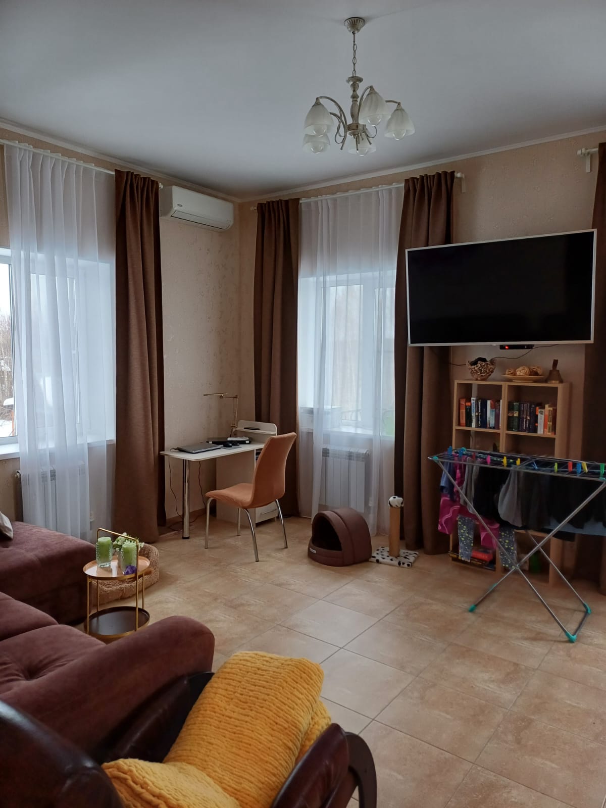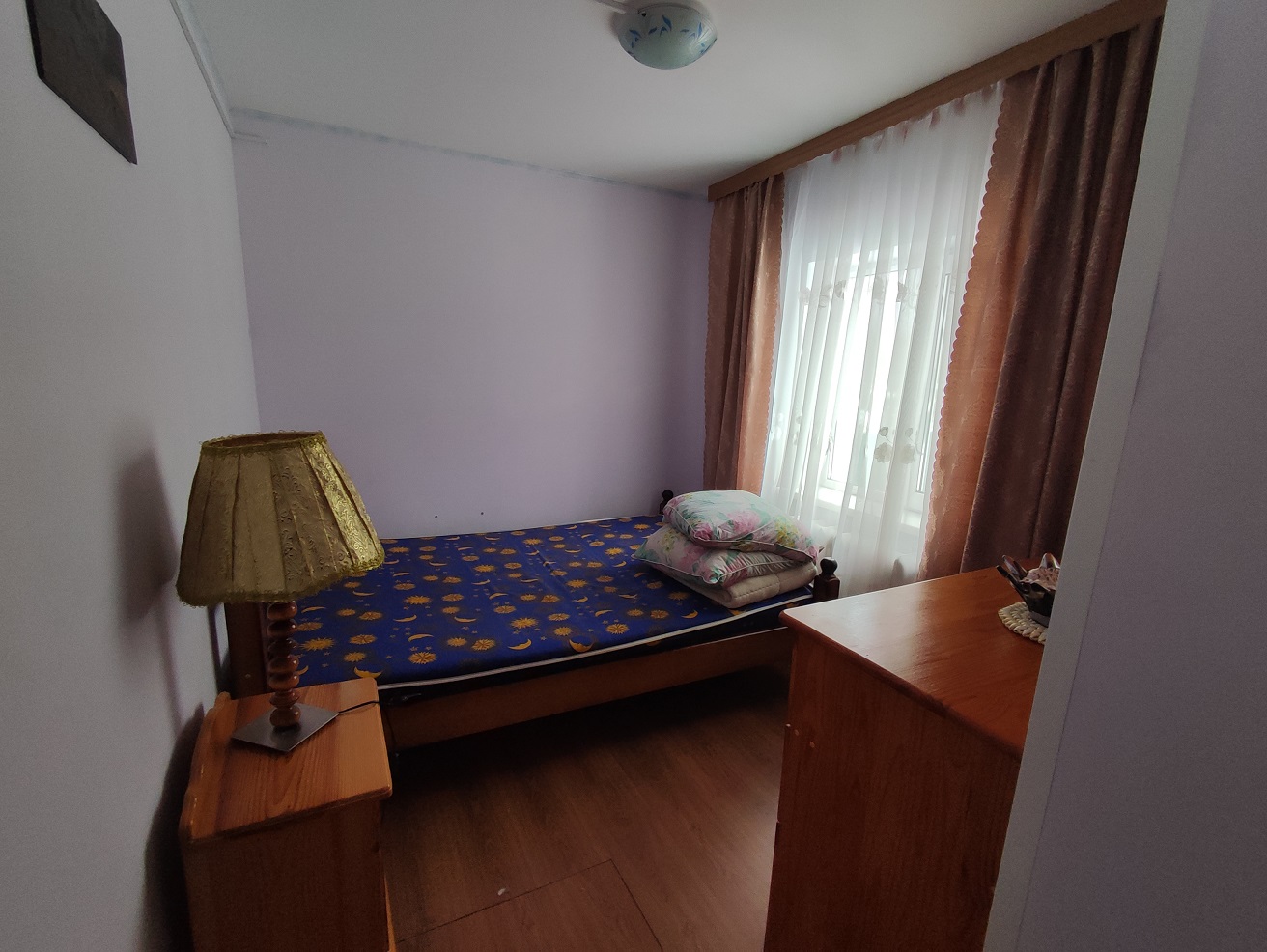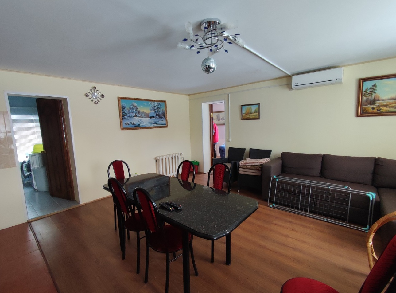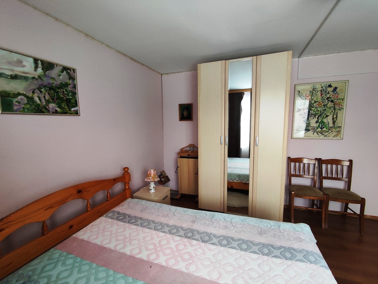 2) Двухэтажный гостевой ДОМ площадью 170 м2. Год постройки 1996. Кровля металлочерепица, ленточный фундамент с цокольным этажом, пол залит бетоном, материал стен рубленое бревно с утеплением, снаружи обшит сайдингом, внутри гипсокартон, ламинат, установлены стеклопакеты. На 1 этаже: гостиная-кухня, зал, спальня, санузел. На 2 этаже: две спальни, кладовка, санузел (душ и туалет). Кондиционер (сплит-система), стиральная машина. Центральное отопление от газового котла в бойлерной по теплотрассе.