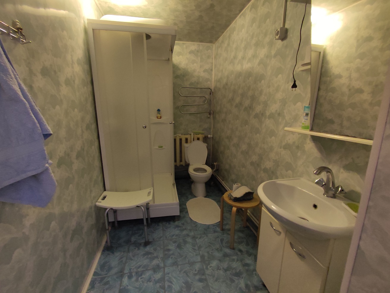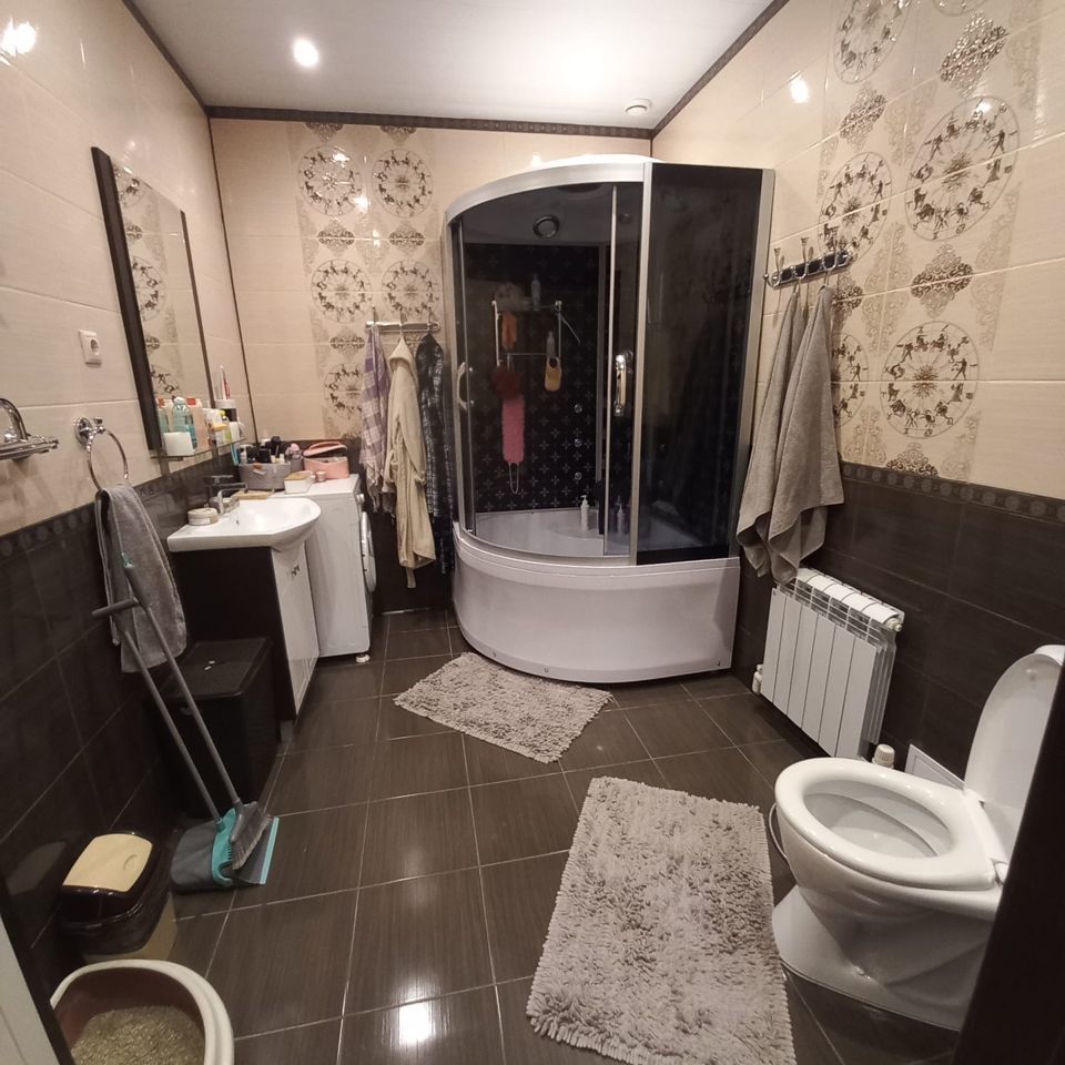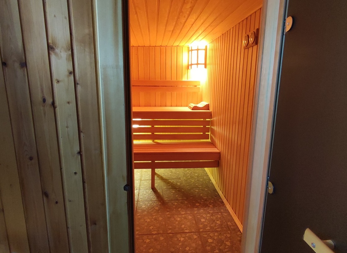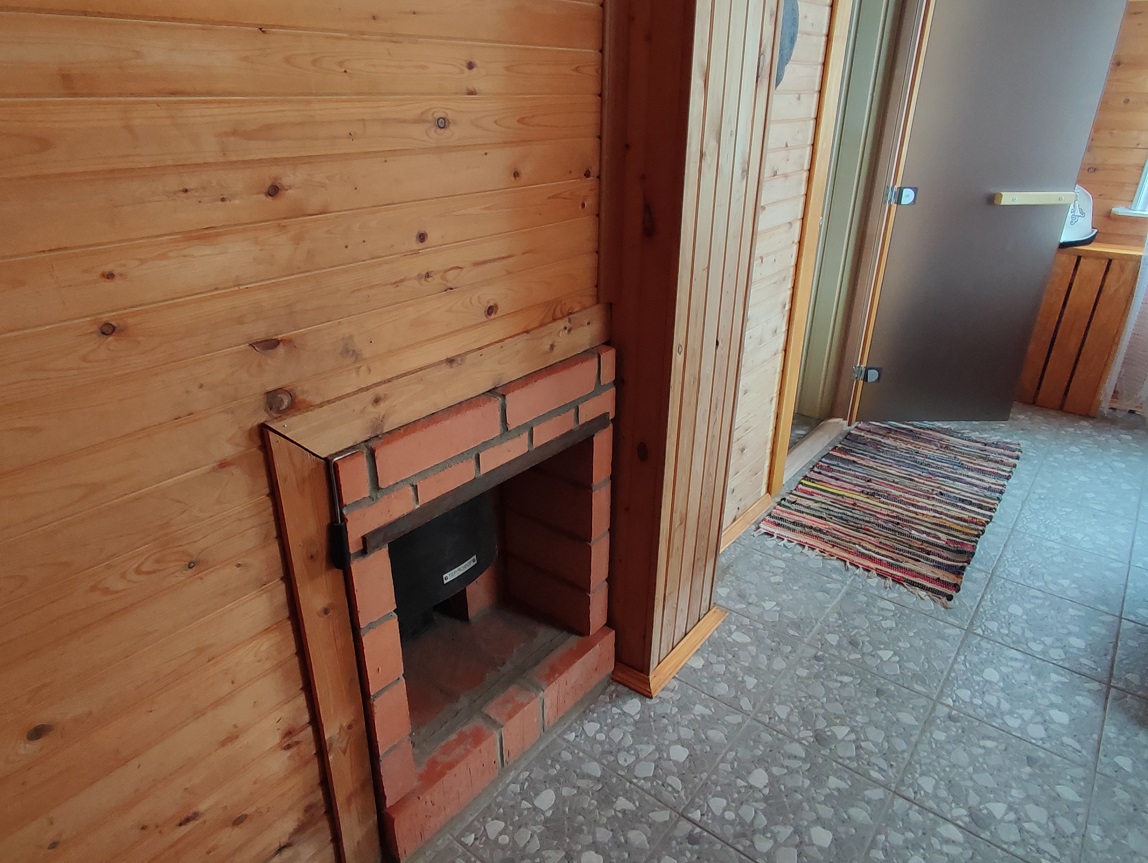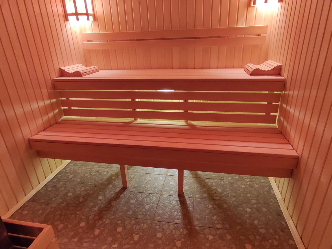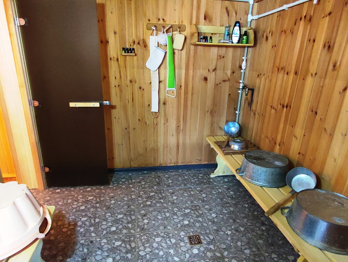 5) БАНЯ площадью 50 м2. Из бруса с утеплением стен 150 мм. Снаружи обшита сайдингом, установлены стеклопакеты, дизайнерский интерьер, в сауне стеклянная дверь. Полы с подогревом (водяной пол). Комната отдыха, парилка, душевая. Отопление центральное от котла из бойлера по теплотрассе.