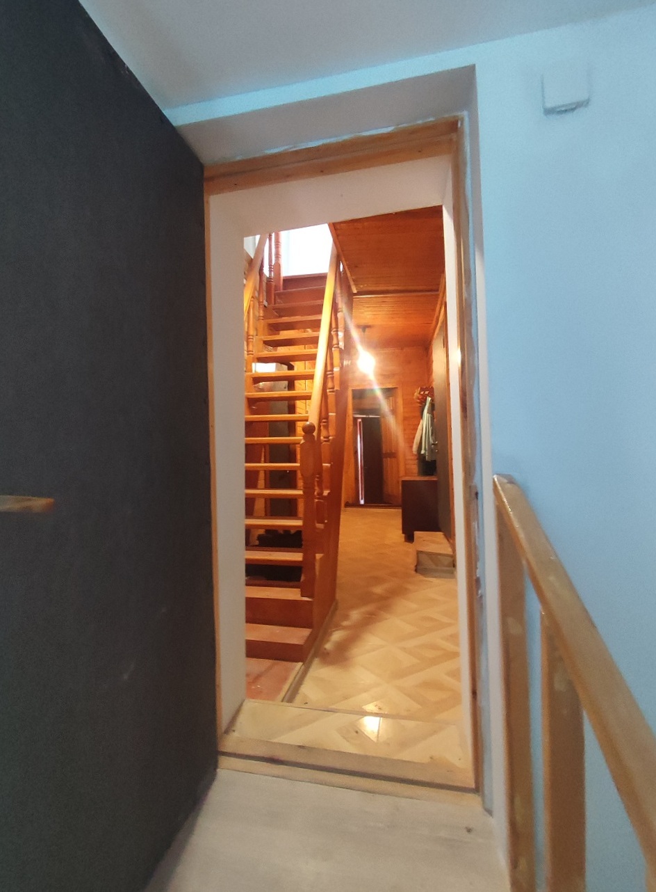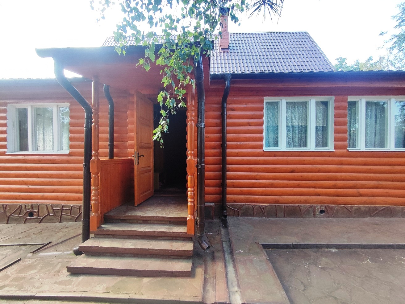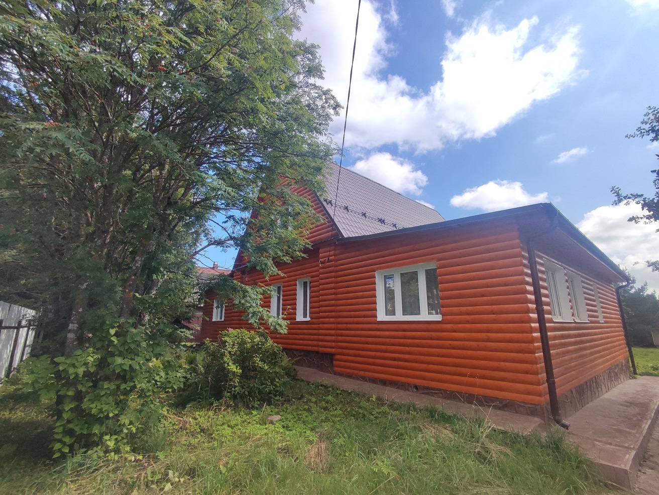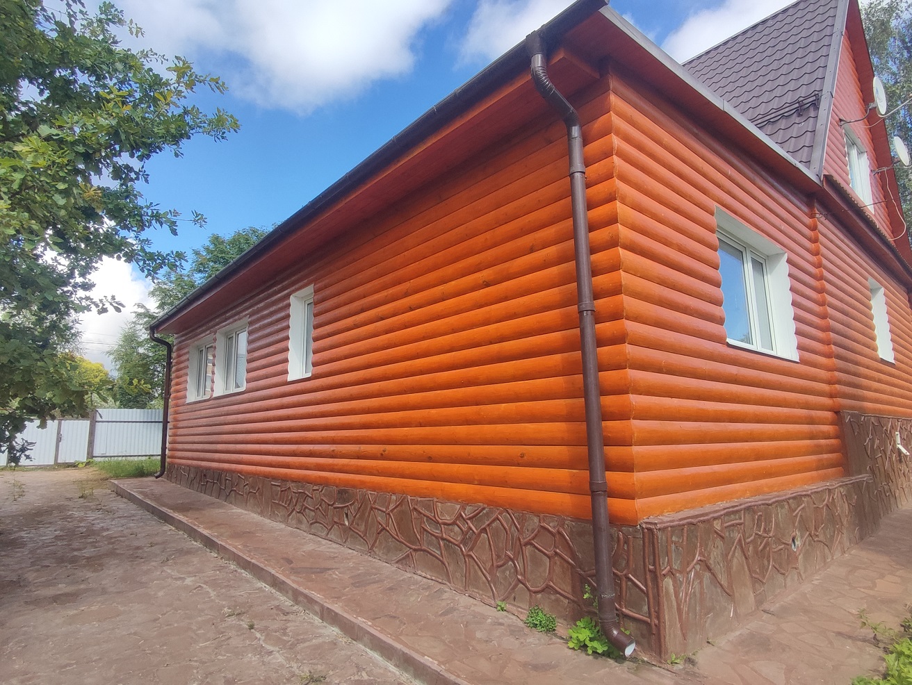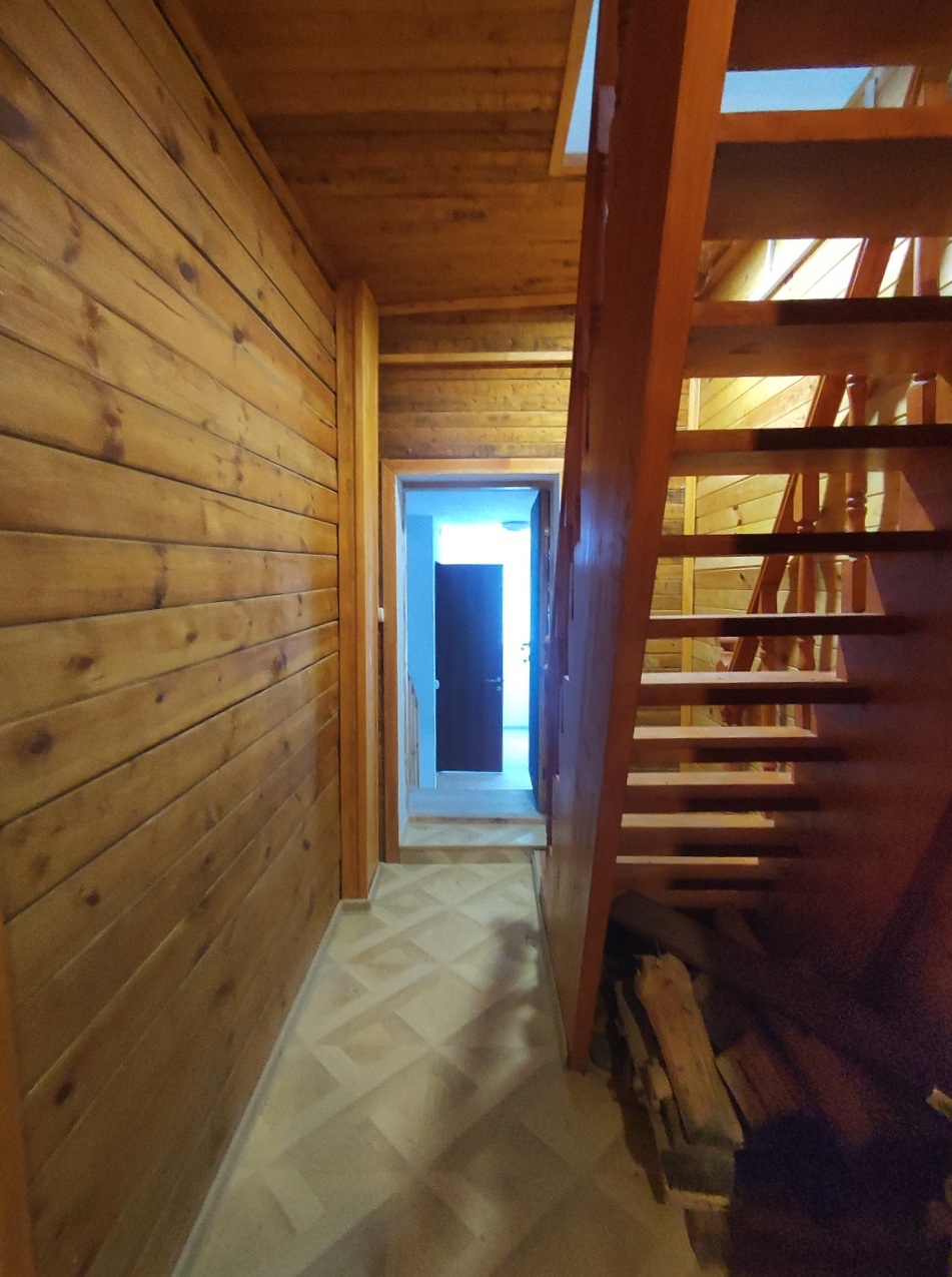 Монолитный ленточный фундамент, бетонная отмостка, декоративная отделка цоколя, материал стен бревно, снаружи обит имитацией бруса, кровля металлочерепица, двойные пластиковые стеклопакеты. К дому пристроены две террасы, утепленный мансардный этаж с отделкой.