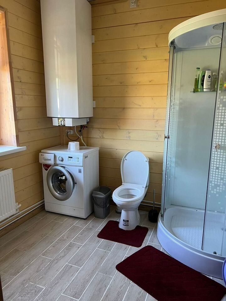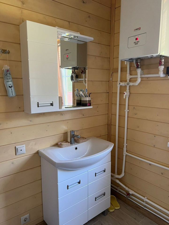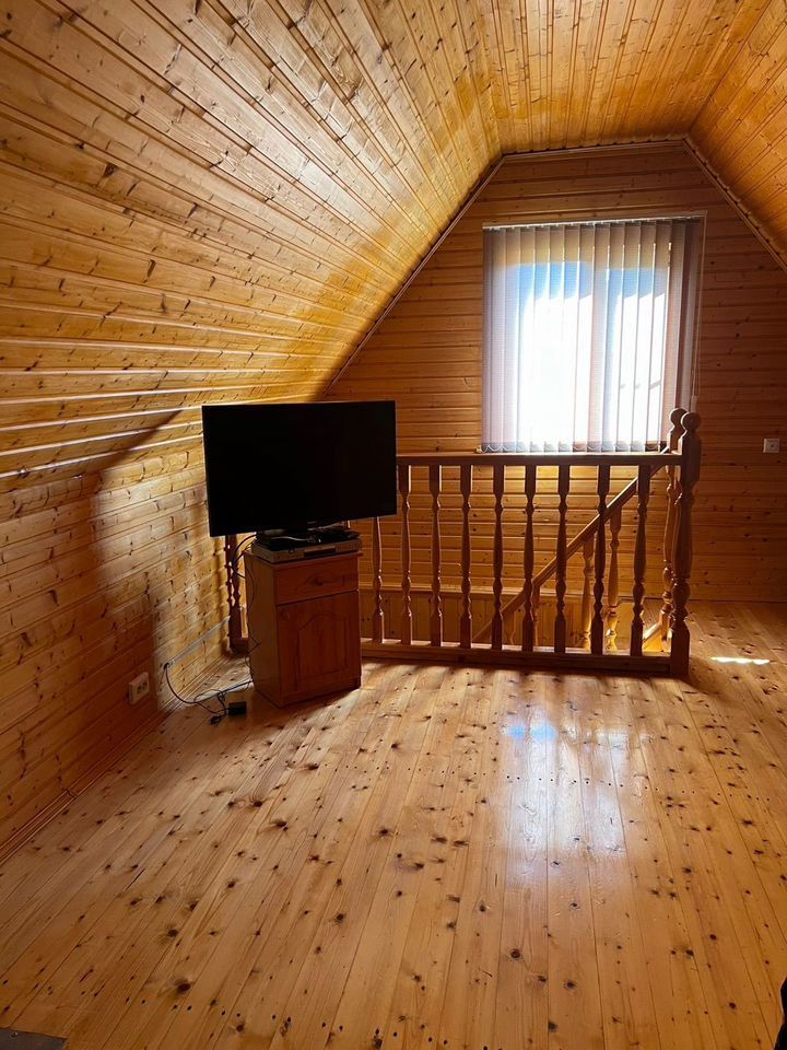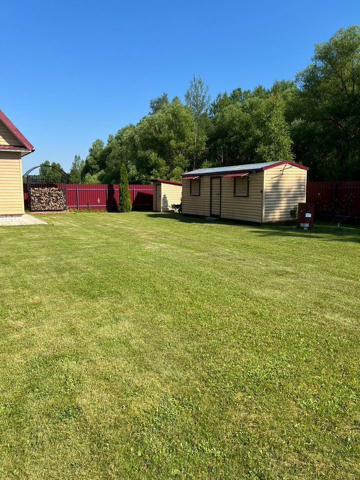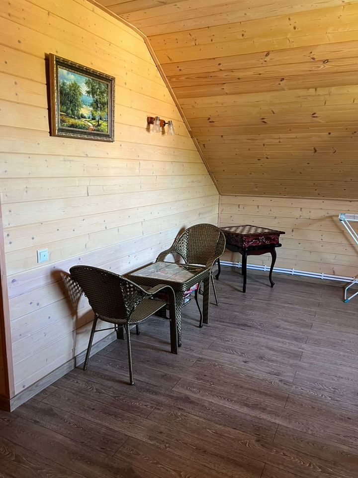 - БАНЯ 2-этажная площадью 50 м2. Парная, душевая, комната отдыха на 2-ом этаже. Материал стен брус 150х150. Снаружи обшита сайдингом, внутри евровагонкой. В бане есть водопровод и отопление (электроконвекторы).