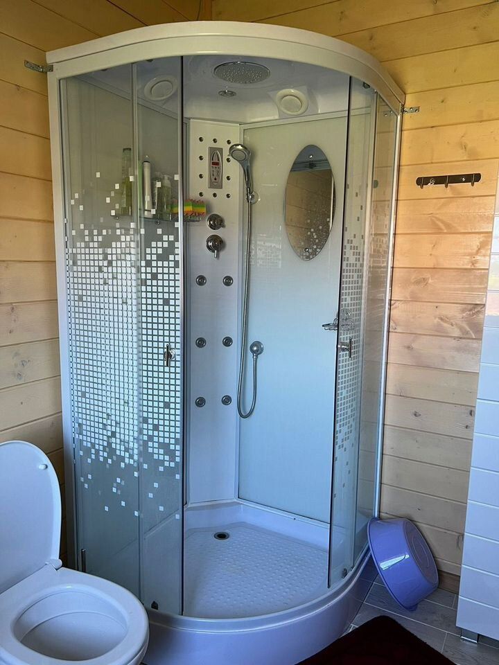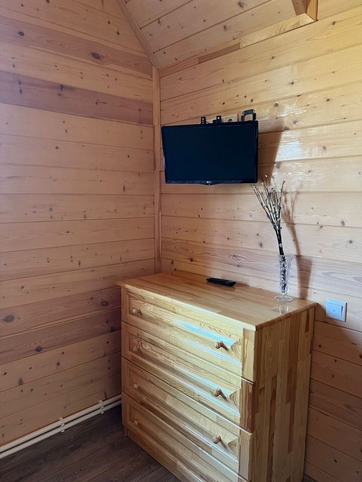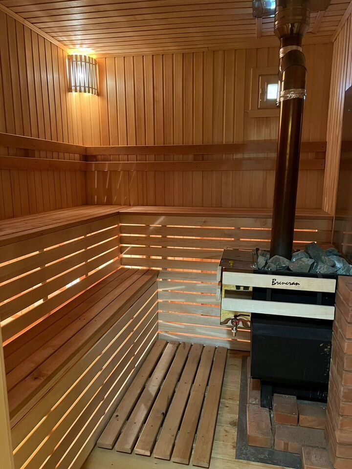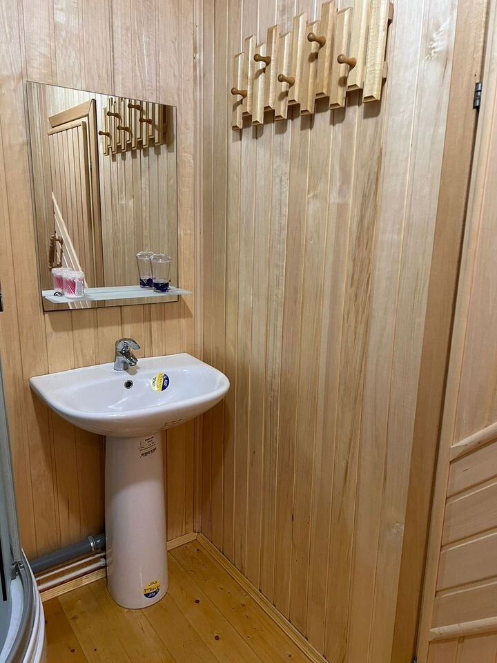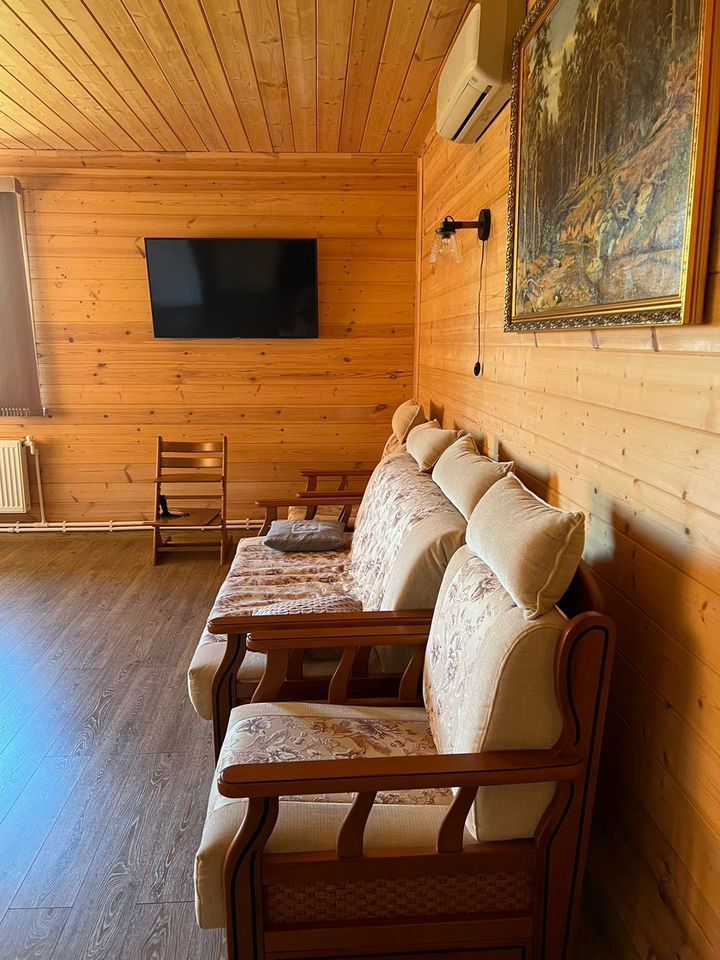 - БАНЯ 2-этажная площадью 50 м2. Парная, душевая, комната отдыха на 2-ом этаже. Материал стен брус 150х150. Снаружи обшита сайдингом, внутри евровагонкой. В бане есть водопровод и отопление (электроконвекторы).