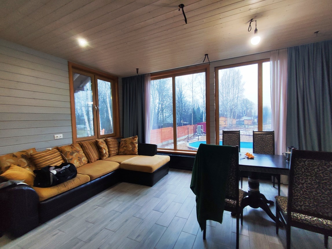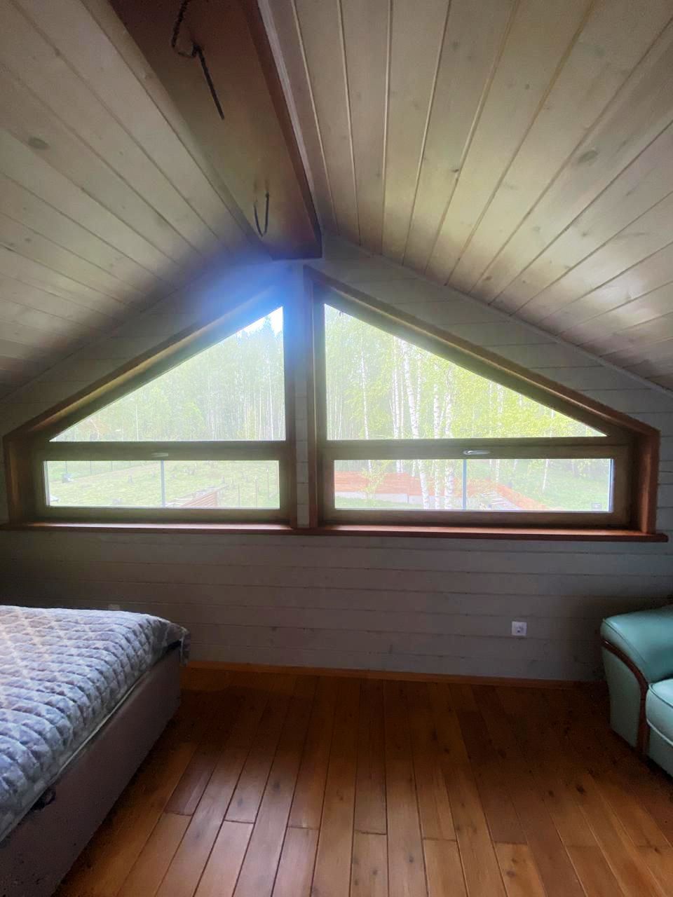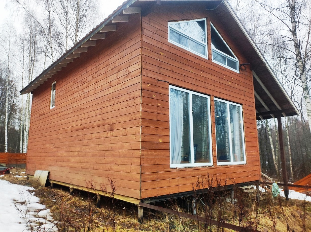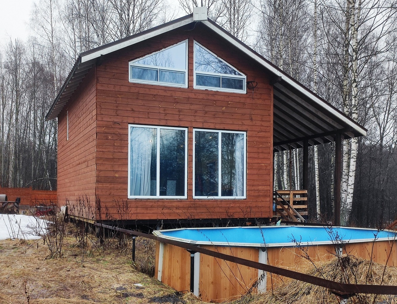 Фундамент на основе винтовых свай с установкой металлического каркаса, материал стен брус 150х150, наружная и внутренняя отделка выполнены имитацией бруса. Установлены стеклопакеты и два больших панорамных окна в пол для любителей солнечного света и обзора.