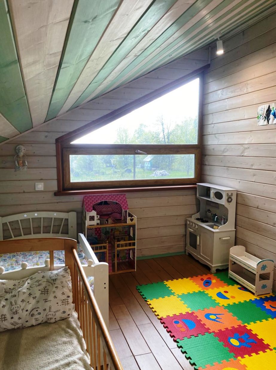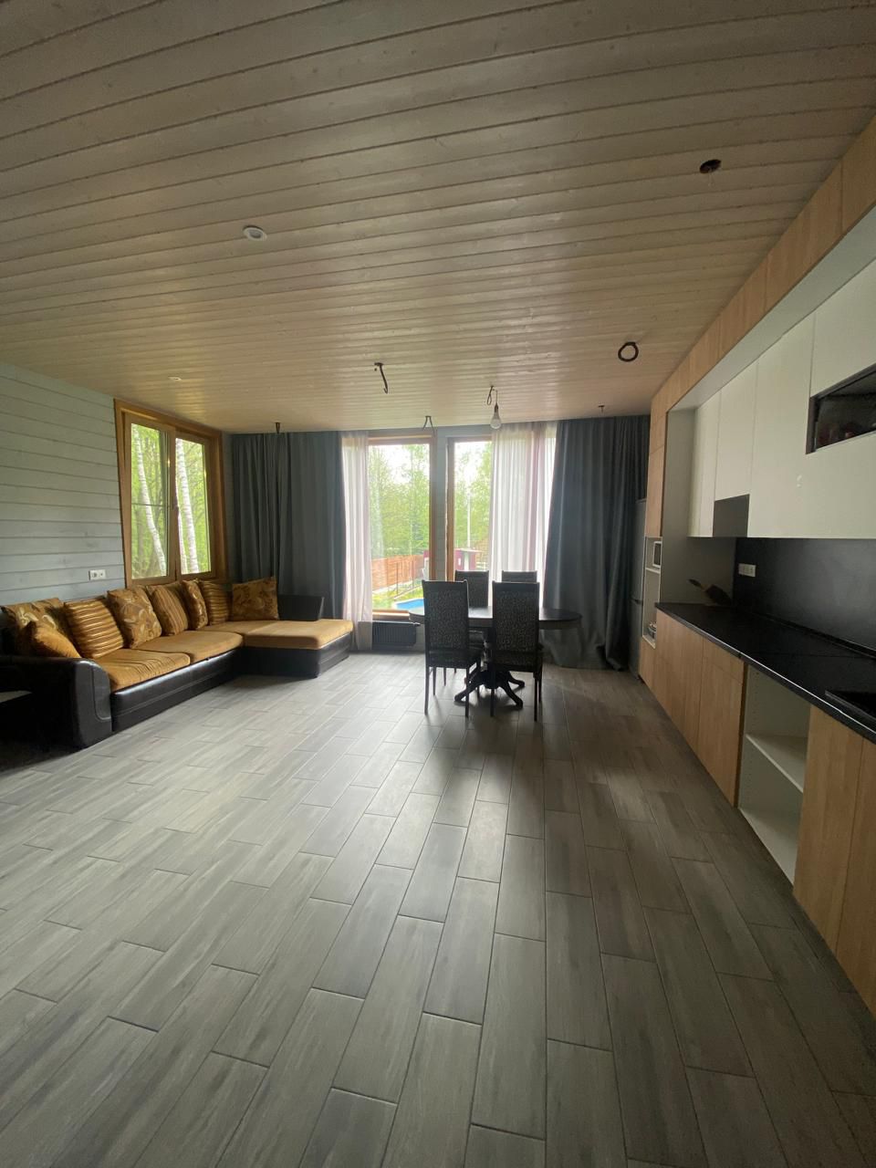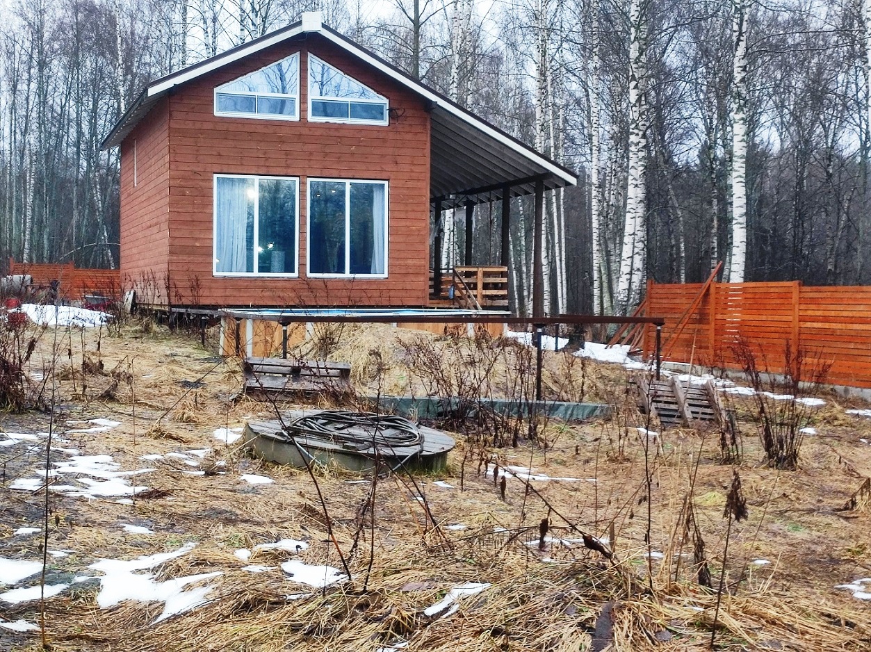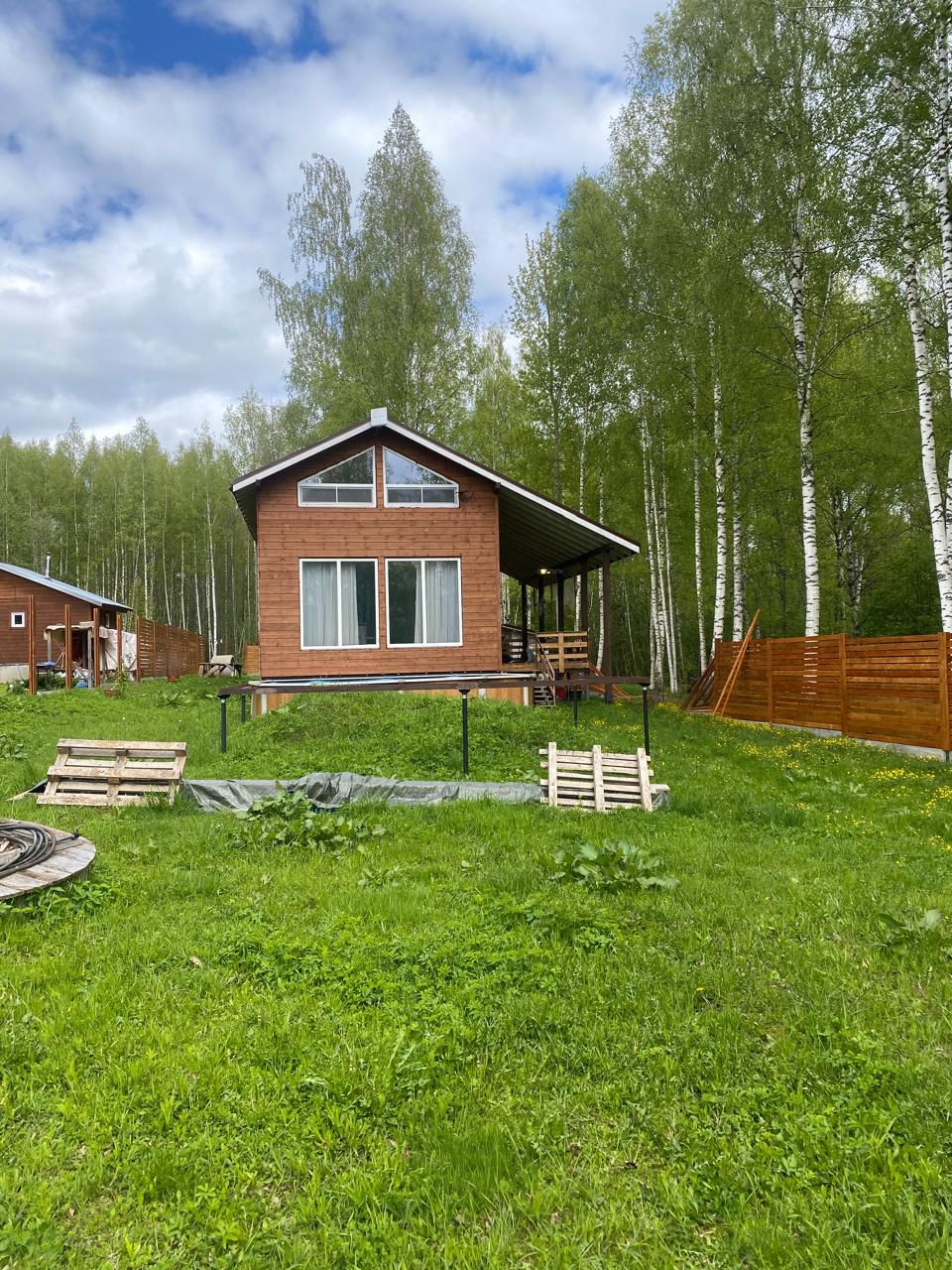 Фундамент на основе винтовых свай с установкой металлического каркаса, материал стен брус 150х150, наружная и внутренняя отделка выполнены имитацией бруса. Установлены стеклопакеты и два больших панорамных окна в пол для любителей солнечного света и обзора.