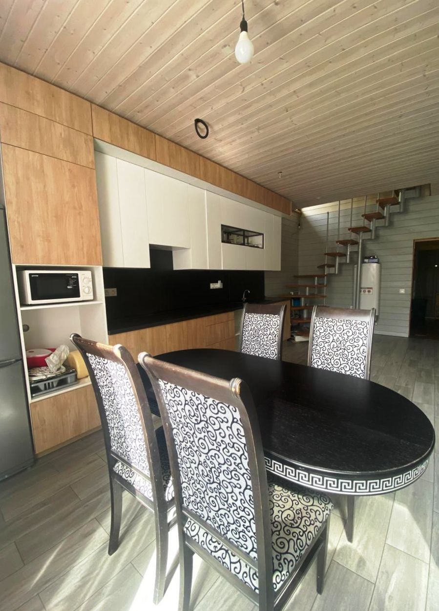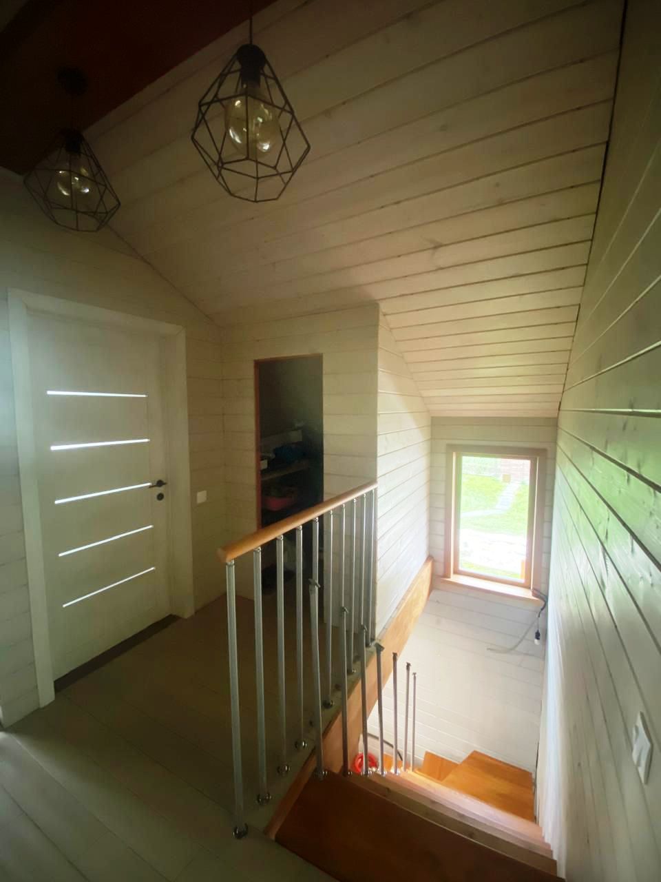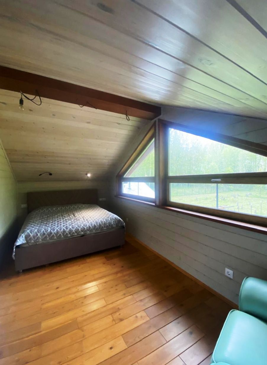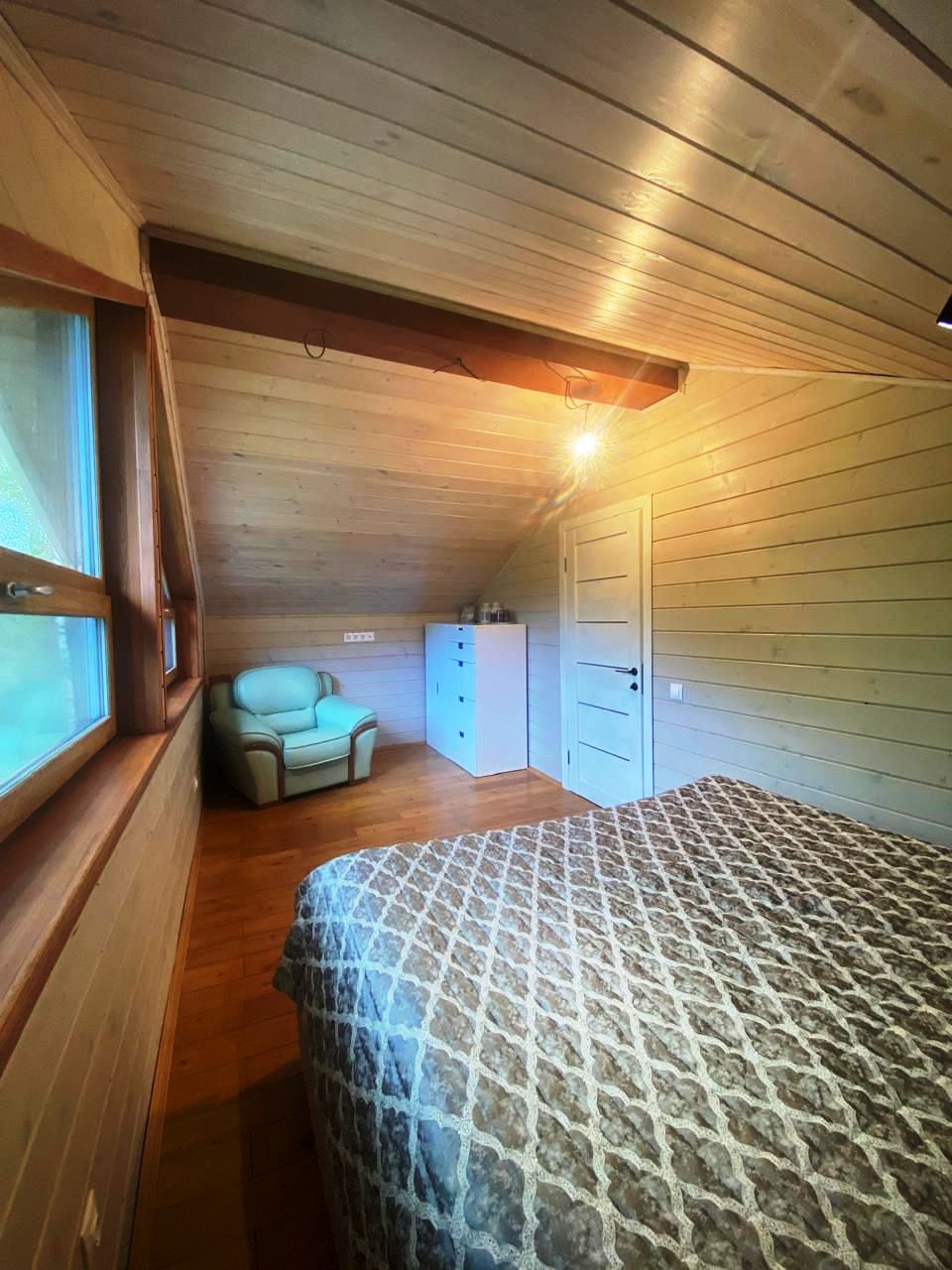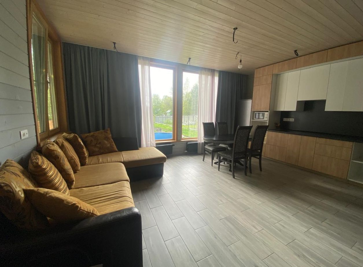 Фундамент на основе винтовых свай с установкой металлического каркаса, материал стен брус 150х150, наружная и внутренняя отделка выполнены имитацией бруса. Установлены стеклопакеты и два больших панорамных окна в пол для любителей солнечного света и обзора.