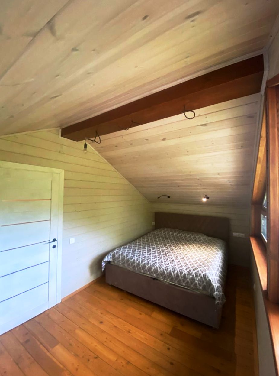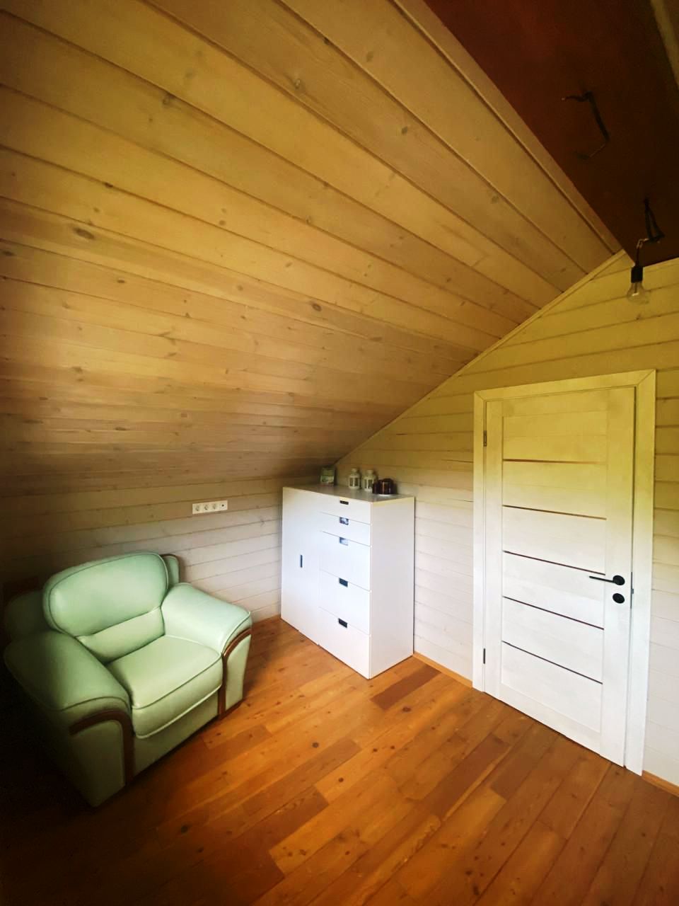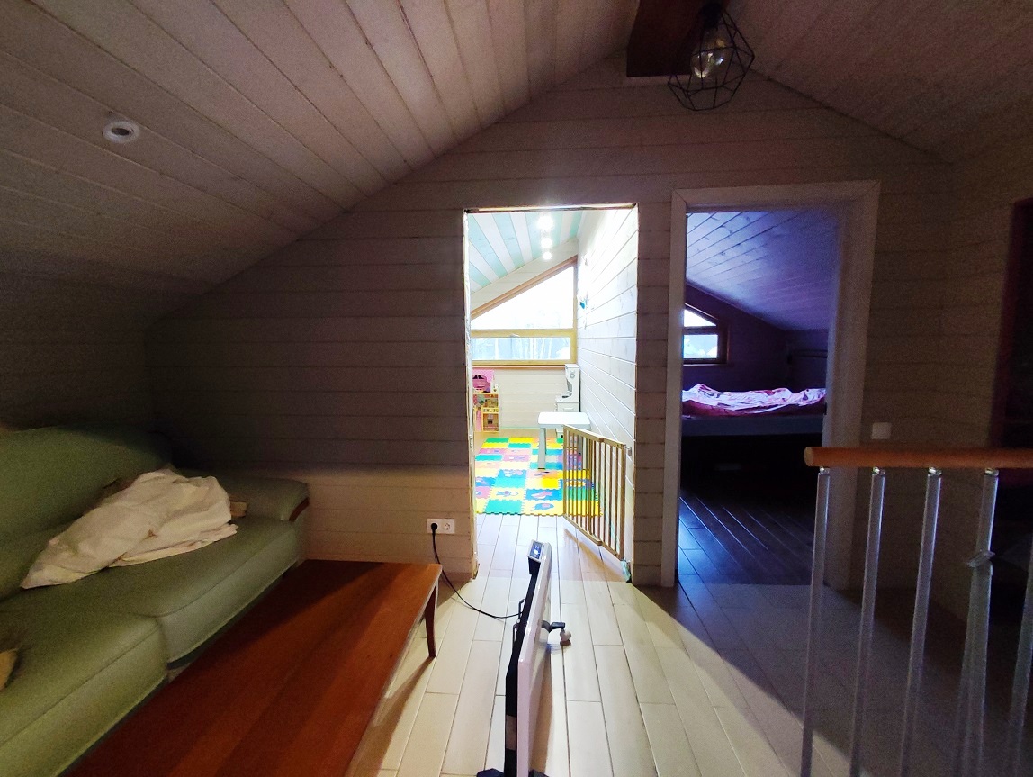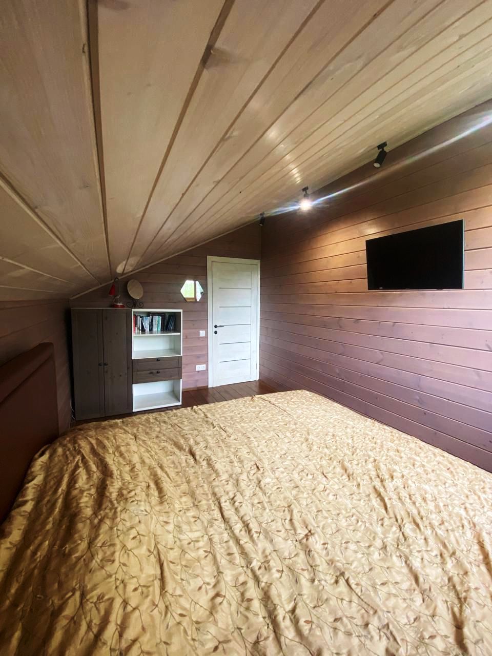 Фундамент на основе винтовых свай с установкой металлического каркаса, материал стен брус 150х150, наружная и внутренняя отделка выполнены имитацией бруса. Установлены стеклопакеты и два больших панорамных окна в пол для любителей солнечного света и обзора.