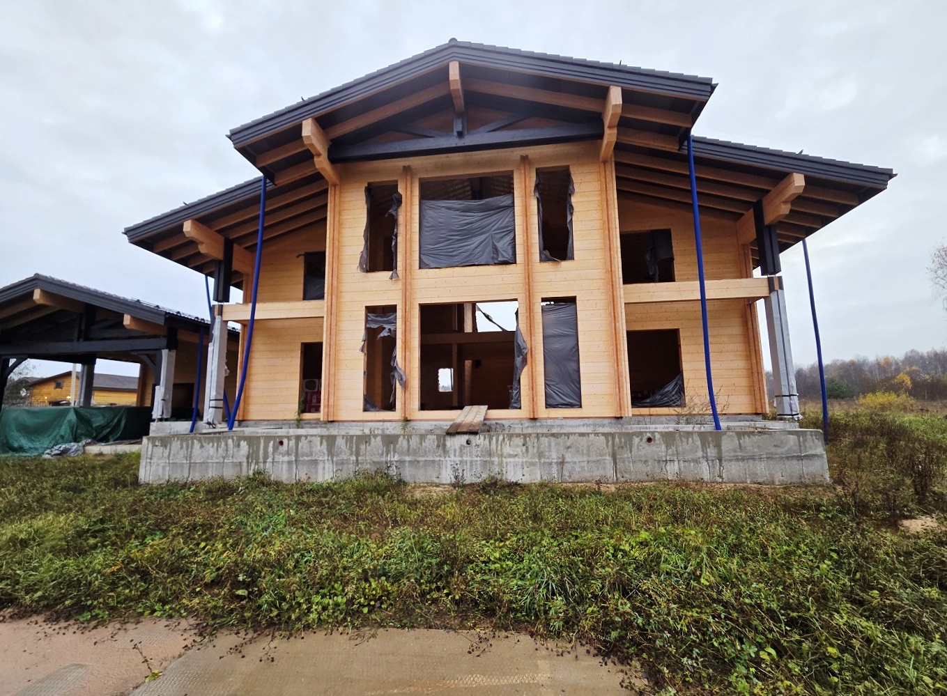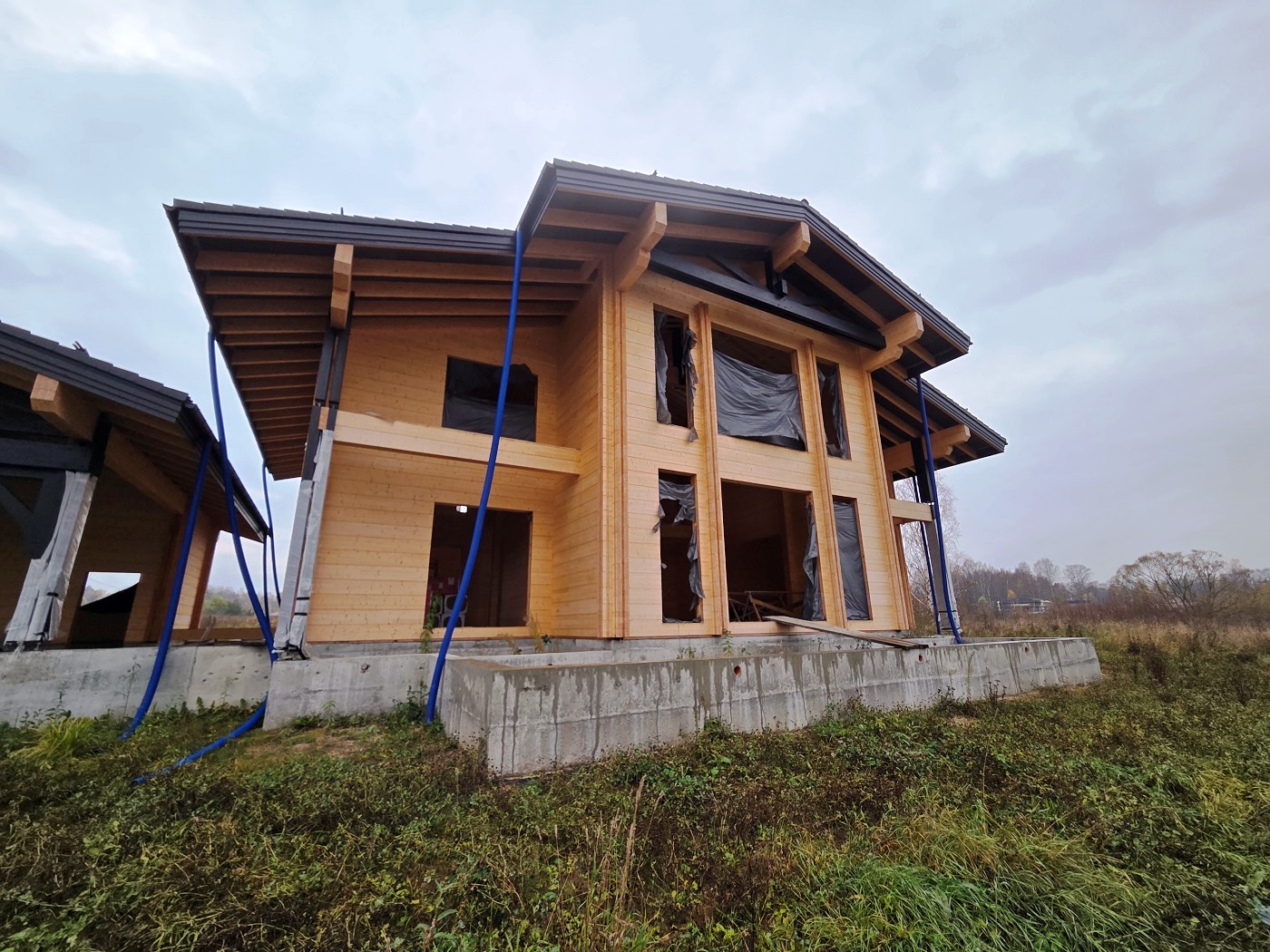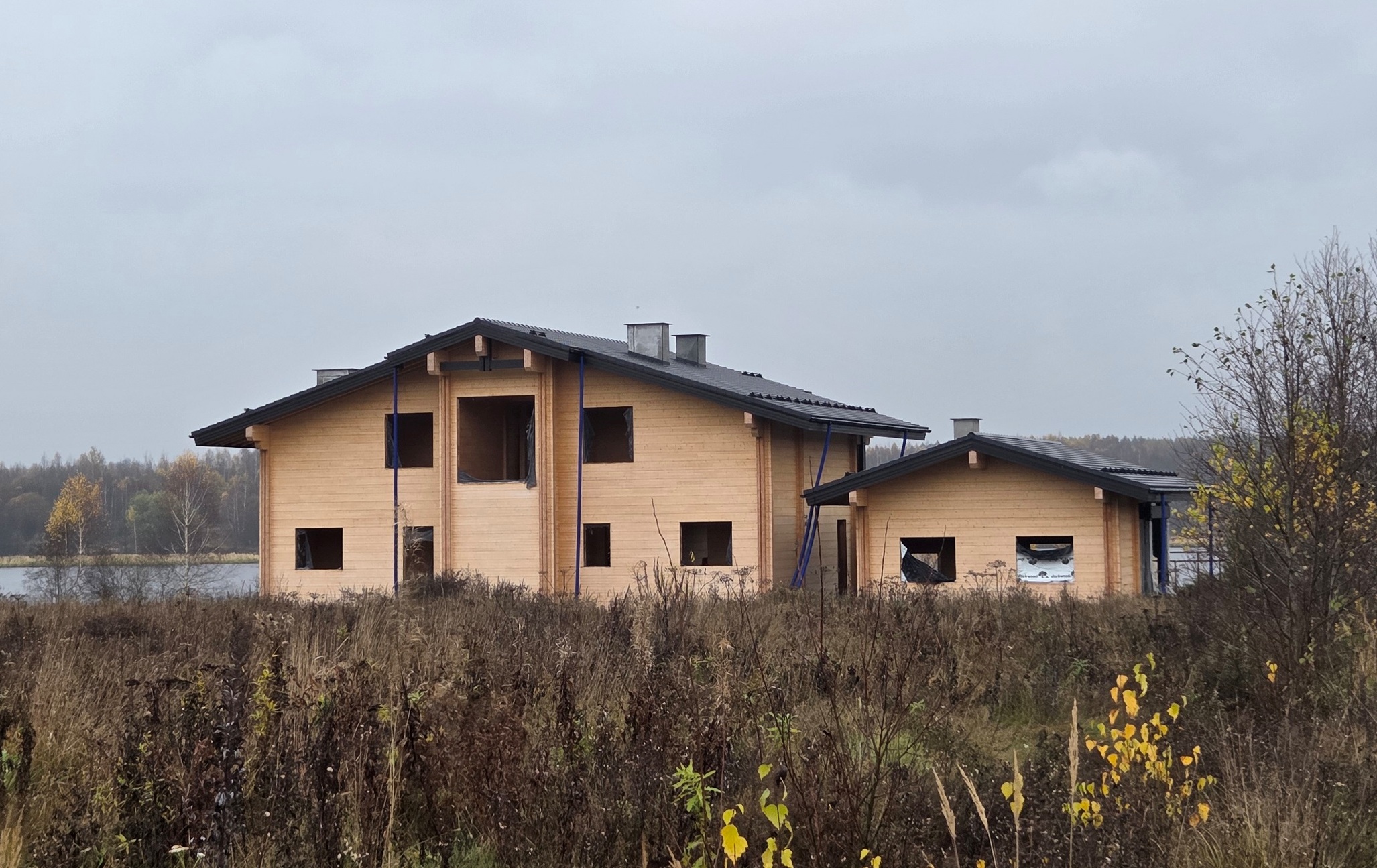 ПРОДАЕТСЯ жилой комплекс загородных зданий общей площадью 637 м2 под отделку. Фундамент монолитная плита на ростверковых сваях. Построен из элитного клееного бруса 220х280. Кровля цементно-песчаная черепица. Перекрытия утеплены минеральной ватой.