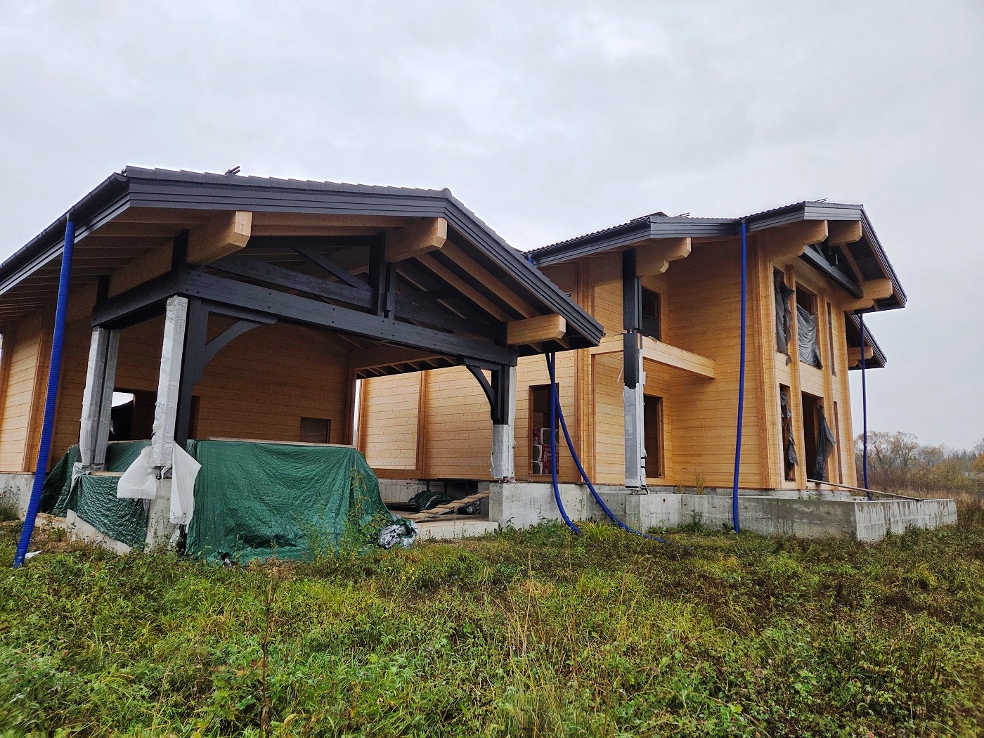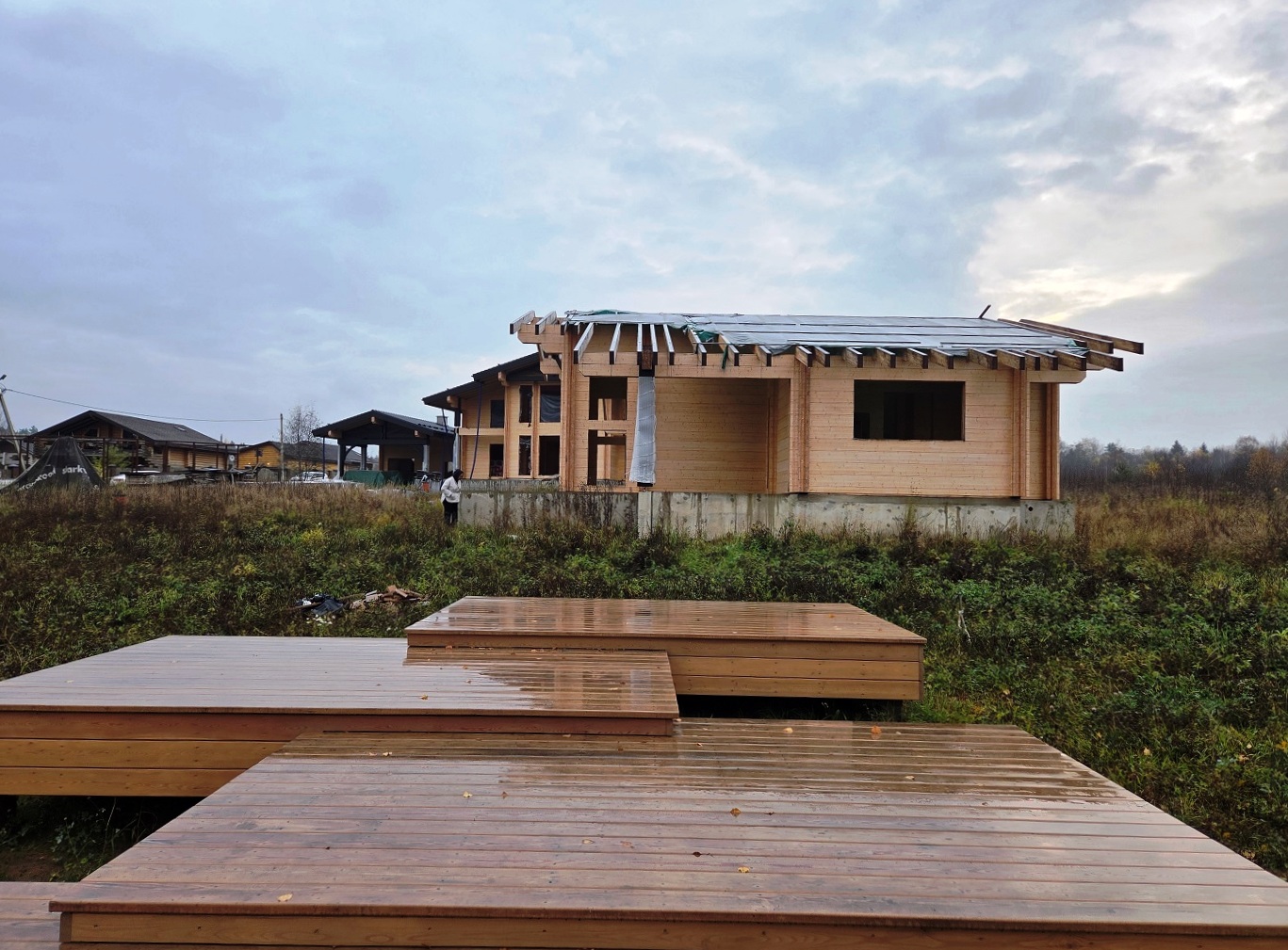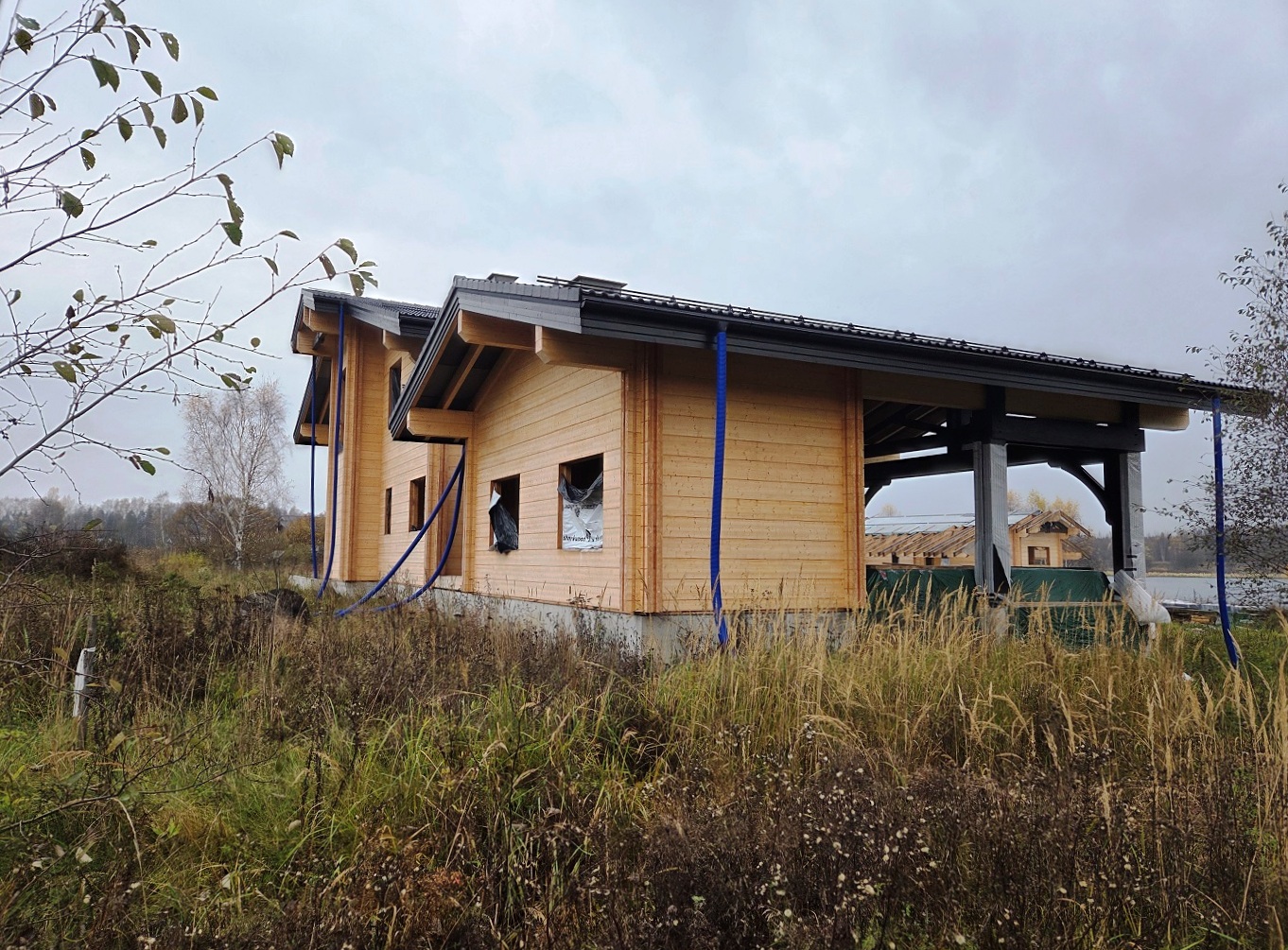 ПРОДАЕТСЯ жилой комплекс загородных зданий общей площадью 637 м2 под отделку. Фундамент монолитная плита на ростверковых сваях. Построен из элитного клееного бруса 220х280. Кровля цементно-песчаная черепица. Перекрытия утеплены минеральной ватой.