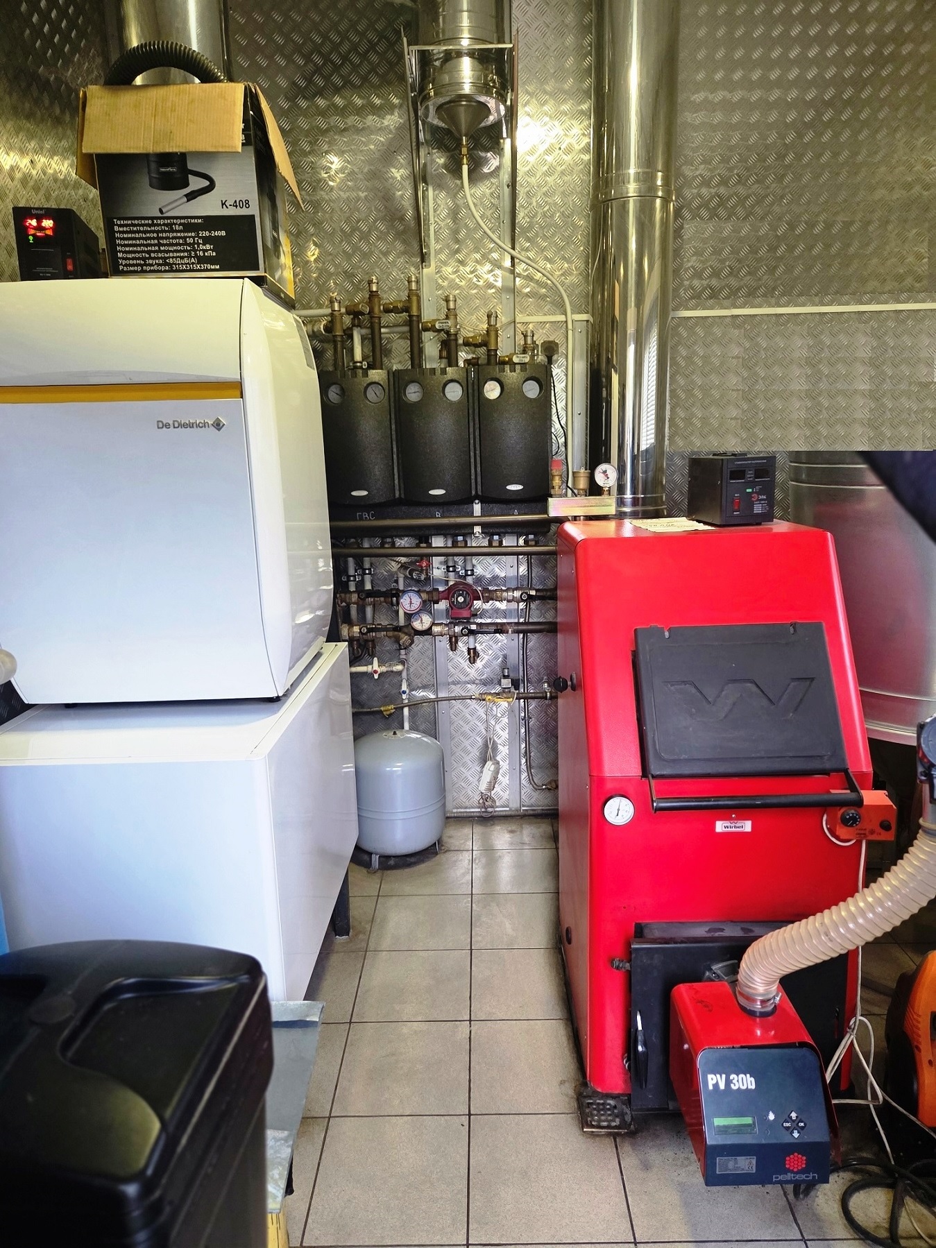 КОММУНИКАЦИИ: электричество 15 кВт, автономный газгольдер, газовое отопление, котельная с теплотрассами ко всем зданиям, зимний водопровод, две скважины глубиной 140 и 25 метров, система водоочистки питьевой воды, несколько септиков. На случай перебоев установлен электрогенератор с автозапуском. В случае перебоев запасов хватает примерно на 2 месяца. В доме для животных есть еще твердотопливный котел на пеллетах.
