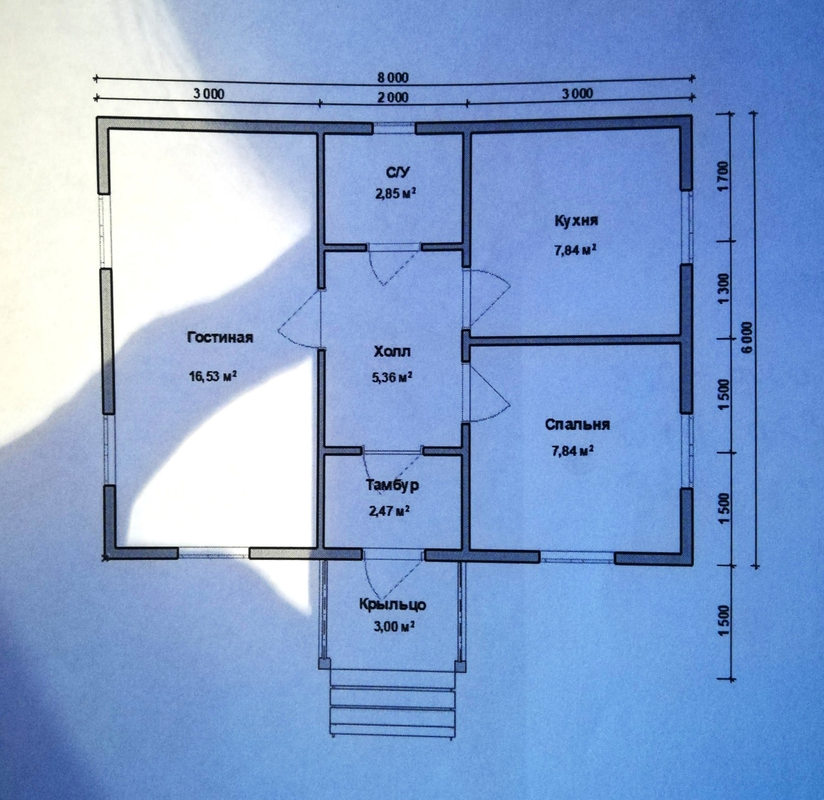 ПЛАНИРОВКА: крыльцо 3м2; тамбур 3 м2; холл 5м2; гостиная 16 м2; кухня 8 м2; спальня 8 м2; санузел 3 м2.