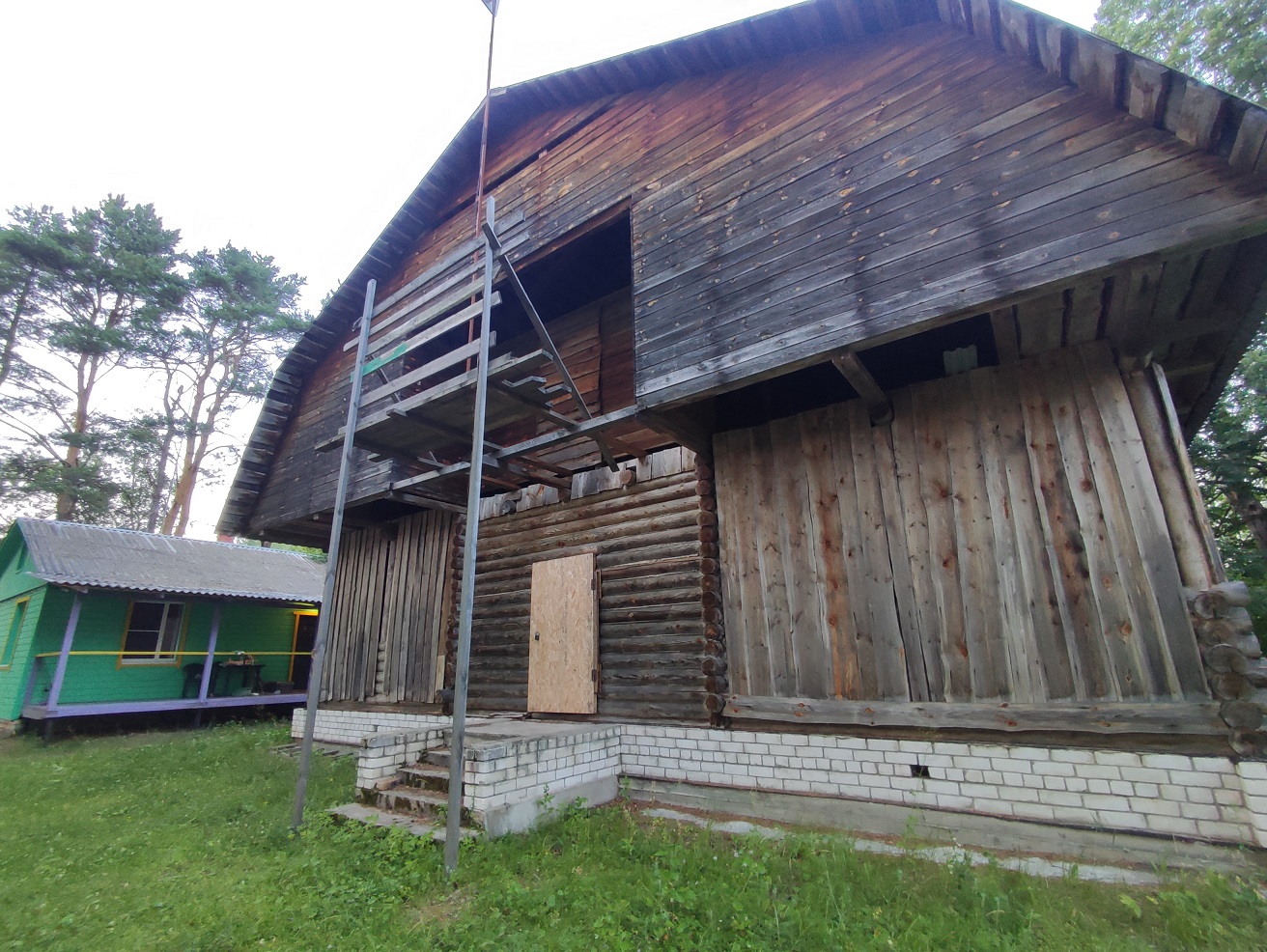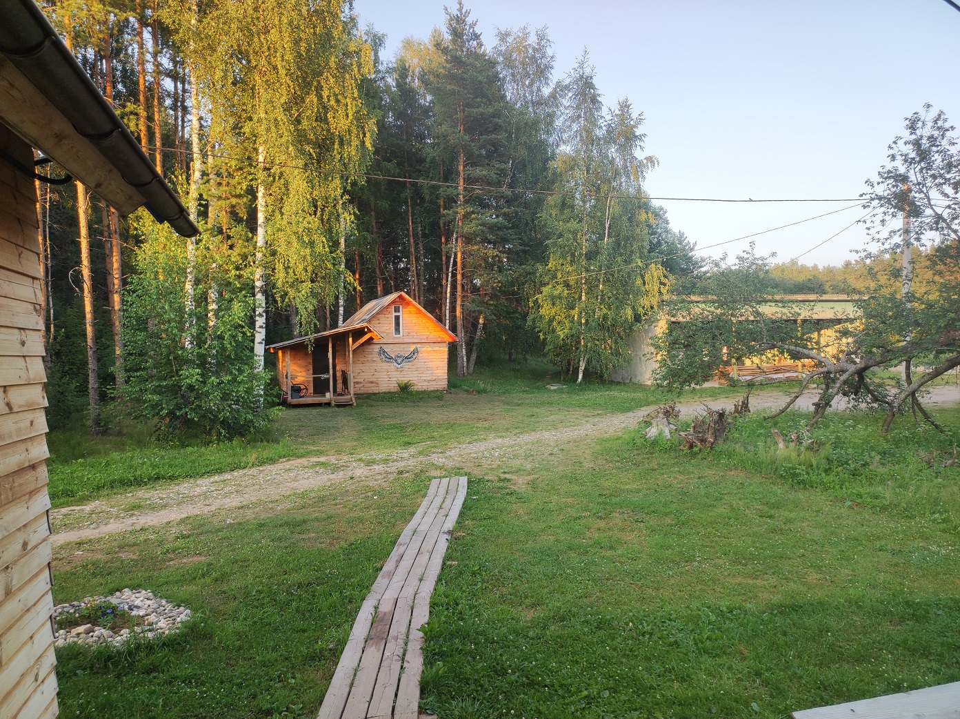 5. Гараж, а также два больших навеса высотой 6 метров для техники и хранения дров, сторожка 27 м2 с печкой и электричеством, недостроенный 2-этажный дом из бревна и уже готовый фундамент (бетонный, ленточный) под дом размером 7х9 м.